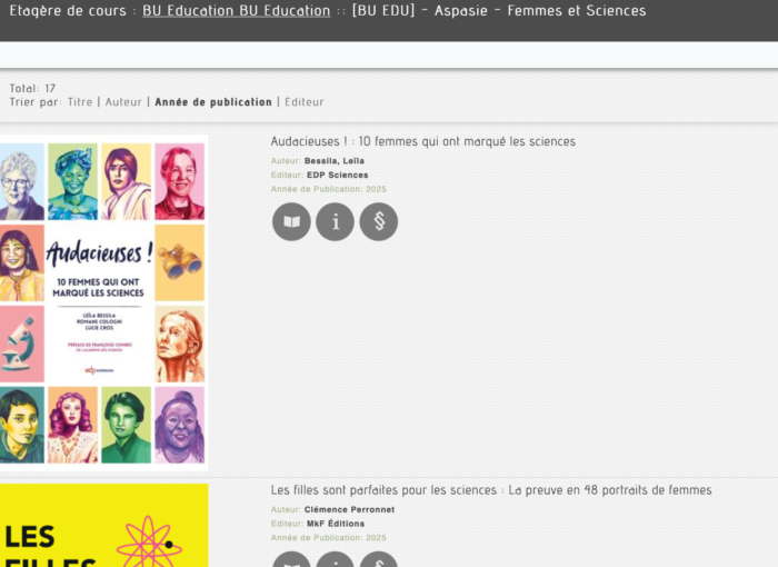 Les équipes des BU (en particulier la BU éducation) et du fond Aspasie vous ont concocté une sélection d’e-books qui mettent en lumière les contributions des femmes dans les disciplines scientifiques :
