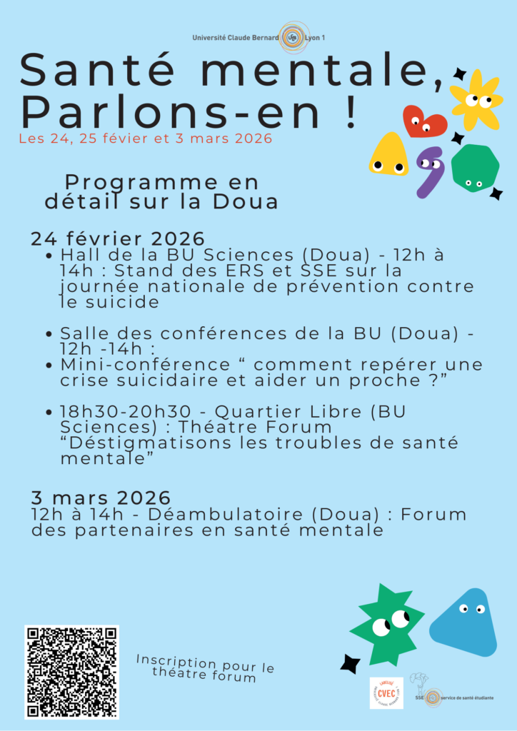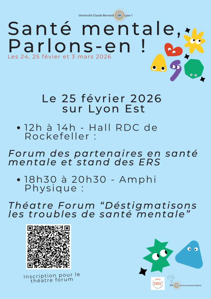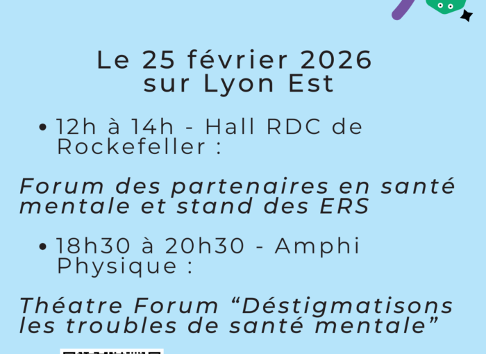 - 18h30 – 20h30 – Quartier Libre (BU Sciences) : Théatre Forum Déstigmatisons les troubles de santé mentale » Inscription