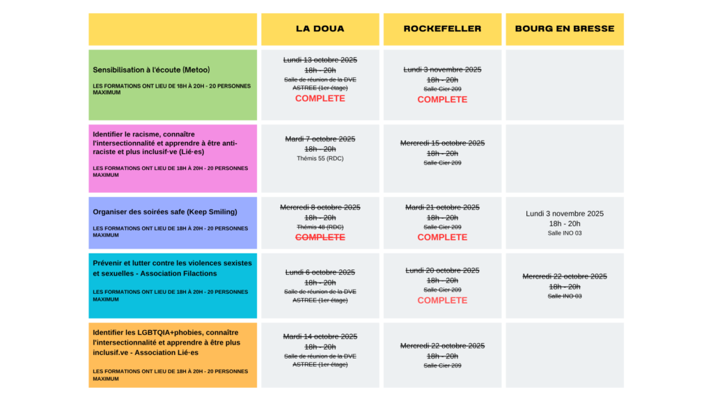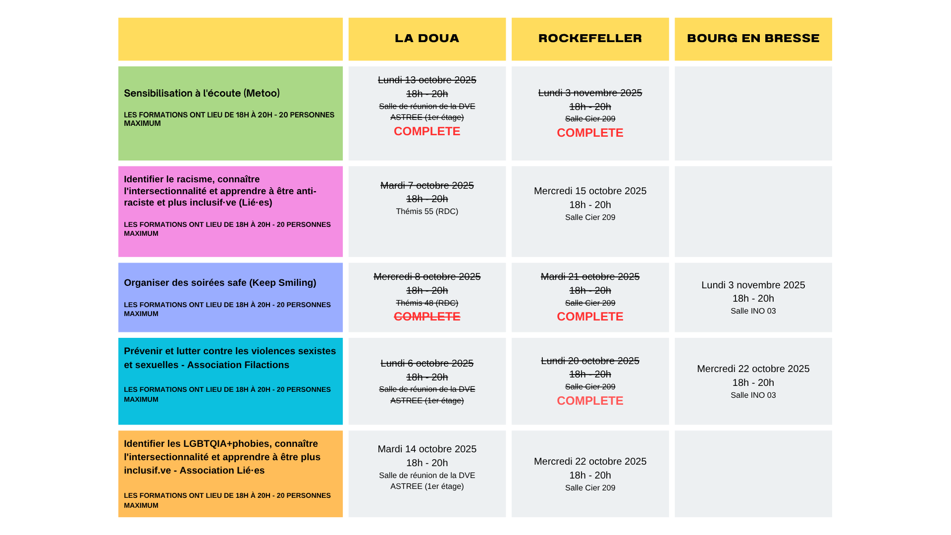La mission égalité-diversité assure les formations des association étudiantes sur les questions de lutte contre les VSS (violences sexistes et sexuelles) et de lutte contre les discriminations. 5 formations sont proposées cette année.